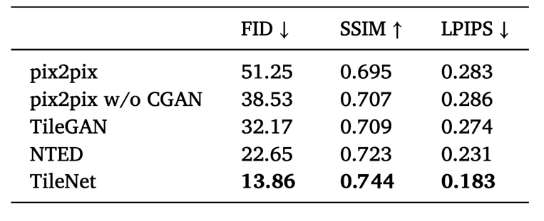 为了验证 TileNet 的有效性,我们进行了系统的定性与定量实验。实验将 TileNet 与多种主流基线方法进行对比,包括 NTED、TileGAN等生成网络。