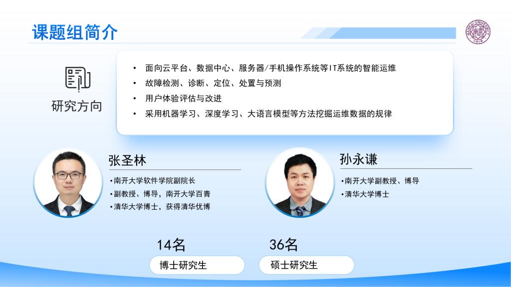 ,整合先进计算与关键软件(信创)海河实验室、天津市软件体验与人机交互重点实验室、数据与智能系统安全教育部重点实验室等资源,形成多学科交叉融合的研究生态,为智能运维技术的基础研究与应用创新提供了坚实的平台保障。
