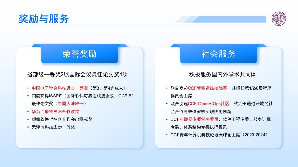 团队获中国电子学会科技进步一等奖、天津市科技进步一等奖等省部级奖励,四度摘得国际软件可靠性会议 ISSRE 最佳论文奖(中国大陆唯一),并获华为 “最佳技术合作教授”、麒麟软件 “突出贡献奖”。同时,积极推动学术生态建设,联合发起 CCF 智能运维挑战赛与 OpenAIOps 社区,核心成员担任CCF 互联网专委、服务计算专委、软件工程专委常委、执行委员等,助力国内外智能运维领域的协同创新。