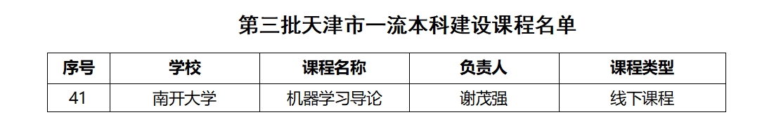 谢茂强老师的《机器学习导论》课程获批天津市一流本科建设课程。