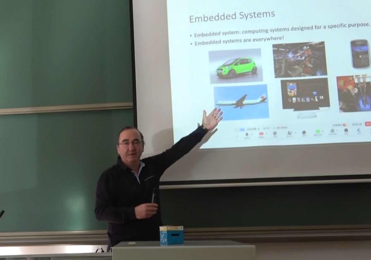 在热烈的掌声中讲座拉开了帷幕。Talpin 教授首先从嵌入式系统谈起,并以现代高端汽车为例展示了这类系统的复杂性,进而引出了建立在其之上的信息物理系统(Cyber Physical Systems,CPS),指出CPS作为计算进程和物理进程的统一体,是集成计算、通信与控制于一体的下一代智能系统。然后讲座重点分析了CPS系统设计在对环境特征及硬件抽象方面,相互关联和相互依赖系统的安全性方面以及时序可预测性(timing predictability)方面的挑战。Talpin 教授详细分析了CPS系统安全性难以保障的原因,并介绍了形式验证与过程认证的两大安全保障方法。针对时序可预测性挑战,重点讲解了CPS系统的正确性验证具有时态性(即要求在正确的时间产生正确的结果),提到了可预测的计算机体系结构,特别是操作系统的可预测性和可靠性。最后讲座涉及了CPS系统的模型及其分析描述语言,并以植入式心脏医疗器械的CPS模型为例具体展示了如何对心脏起搏器和病人的心脏建模,进一步基于时间自动机(timed automata)通过模型检测技术来验证所构建模型的性质。