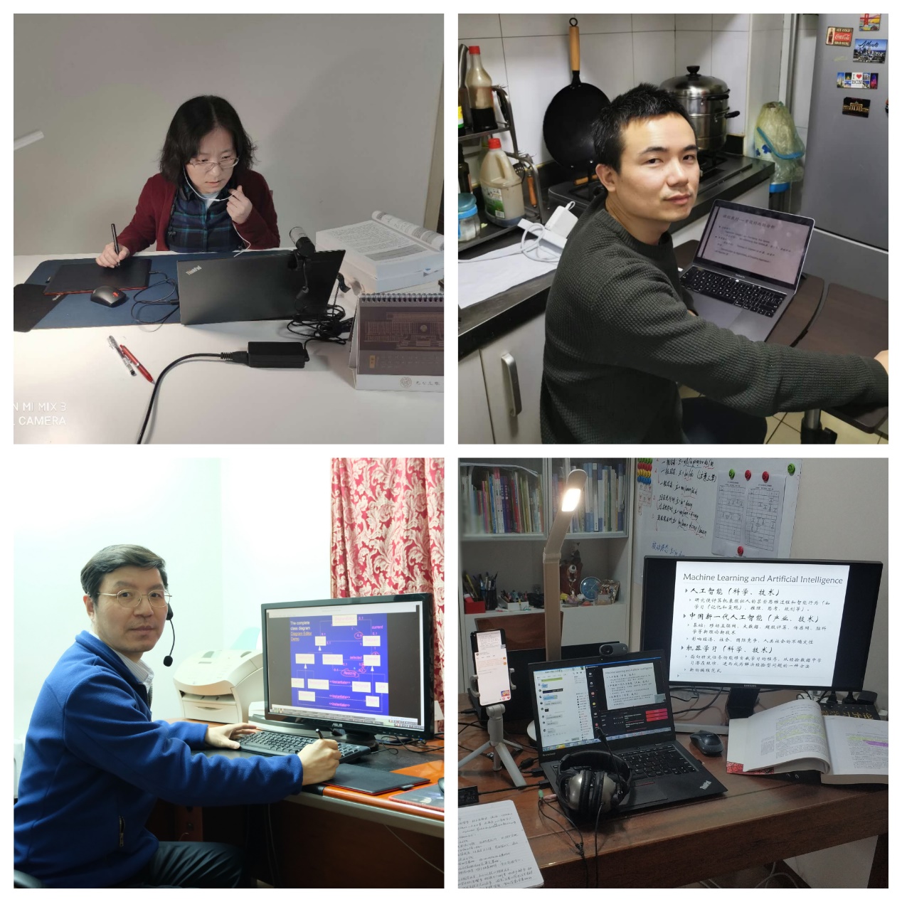 教师们也在家克服各种困难积极参加培训和备课,不断学习、尝试各类在线教学平台、视频编辑软件,并互相分享经验。有的老师孩子太小,躲在厨房中录播;有的课程因课间播放课程有关视频被差点因版权而封禁;有的老师在开学前组织学生测试在线教学平台;有的老师在家自建录播环境,保证录播质量……