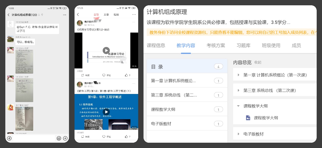在教学活动组织方面,教学办在开学前一周组织师生为所有课程建立课程群,并选派课代表协助所有选课学生进群。通过主讲教师、助教研究生、课代表和课程群的方式为师生建立有效的沟通渠道,使学生在在线教学平台外沟通顺畅,进而保障教学活动平稳有序。