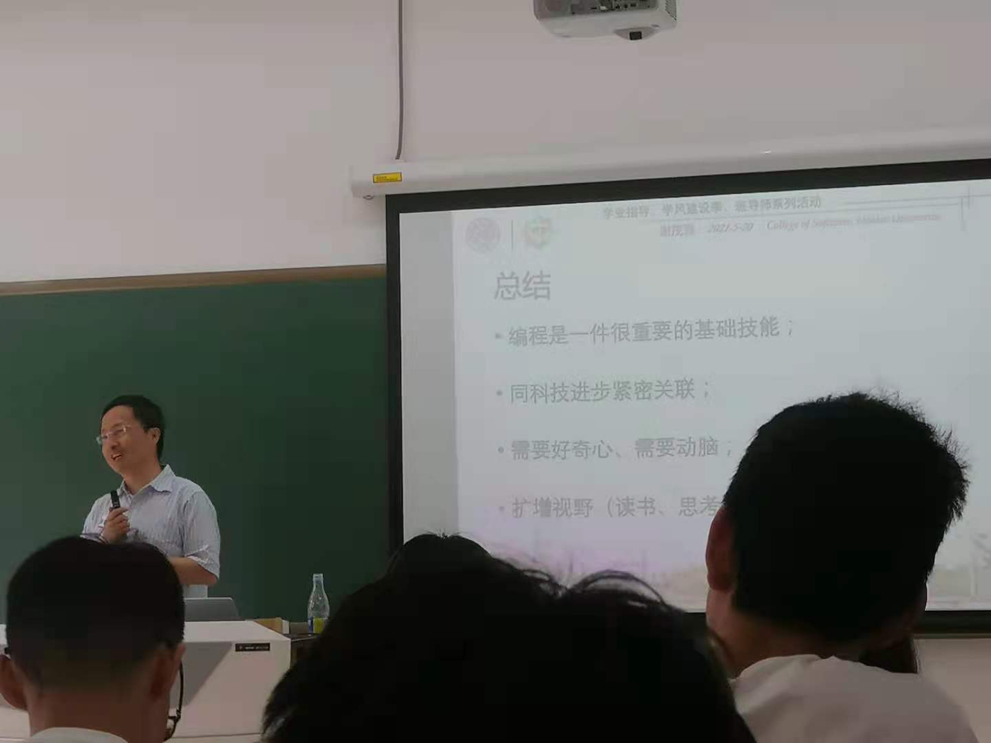 谢老师在班会之初,从院友发展、深造和学习困境三个方面细致讲述了开展此次班会的缘起,希望同学们在这些方面的困惑能够得到解答。在班会过程中,谢老师再次提出了软件工程专业的培养目标,回答了“成为什么样的人”,“如何用好南开的环境”和“如何搞好专业学习”等问题。