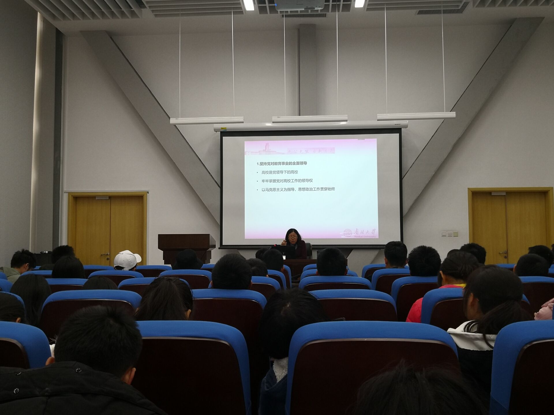 崔满顺首先介绍了全国教育大会召开的背景、内容、意义,着重对推进我国教育改革发展的“九个坚持”、 “为党育人,为国育人,为党育人的初心不能忘,为国育人的立场不能改” 的教育主线、“六个方面”下功夫三方面进行了重点解读。崔满顺强调了牢牢坚持党的领导对高校教育事业发展的作用,并援引张伯苓老校长的爱国三问与奥运三问来阐述南开学子应树立坚定的理想信仰,厚植爱国主义情怀。她强调,南开有着优秀的爱国传统,不管是建校初期,西南联大期间亦是建国之后,“爱国”始终是南开人最核心的价值观念。最后,崔满顺向同学们展示朗读了杨石先老校长的入党申请书,播放专题片《榜样3》并围绕“为什么要入党、如何入党、入党标准”这一问题与同学们进行交流,加深同学们对信仰与榜样的感性认识。