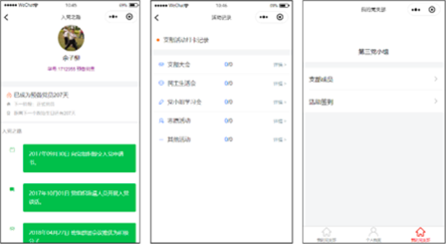 支部成员余子柳等人还结合党建日常工作特点需求,设计开发“党建微引擎”小程序,实现发展倒计时、线上签到等功能,把党建管理数据库扩展到入党申请人、积极分子层面,完善发展党员流程,配合“党建云”app加强组织建设。项目参与者、2017级本科生朱俊说:“参与党建微引擎的开发,让自己对入党的流程有了更为深刻的认识,同时专业能力也得到了锻炼,希望今后能更多利用自己的专业知识服务人民、服务社会。”